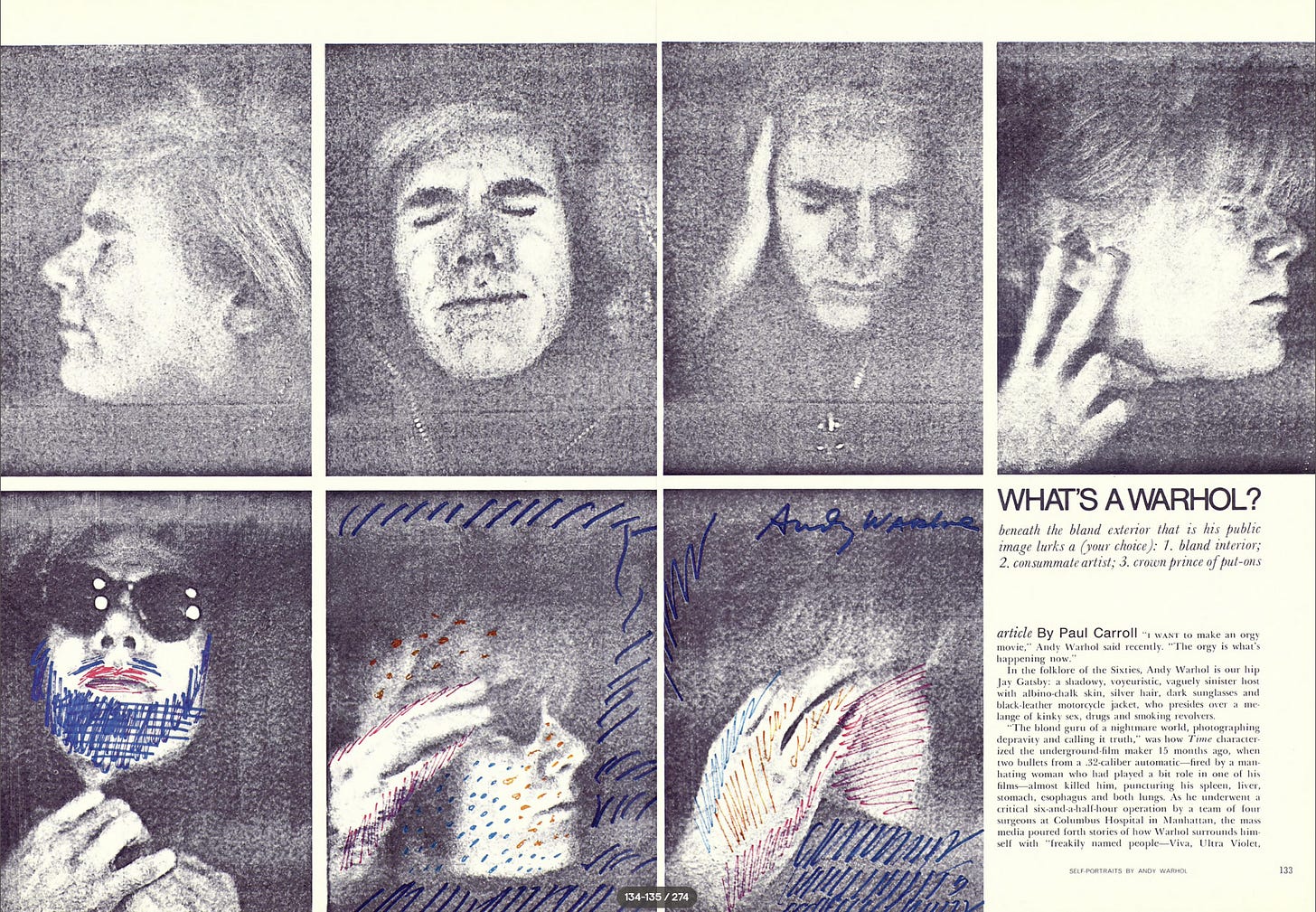 Who’s Warhol? In this profile it’s made obvious that Warhol deals in personas. The person he was at home, was not who, or what, he was at large. And the best comparison I can make is that he was at times an expressionless teddy bear for the masses to project on.