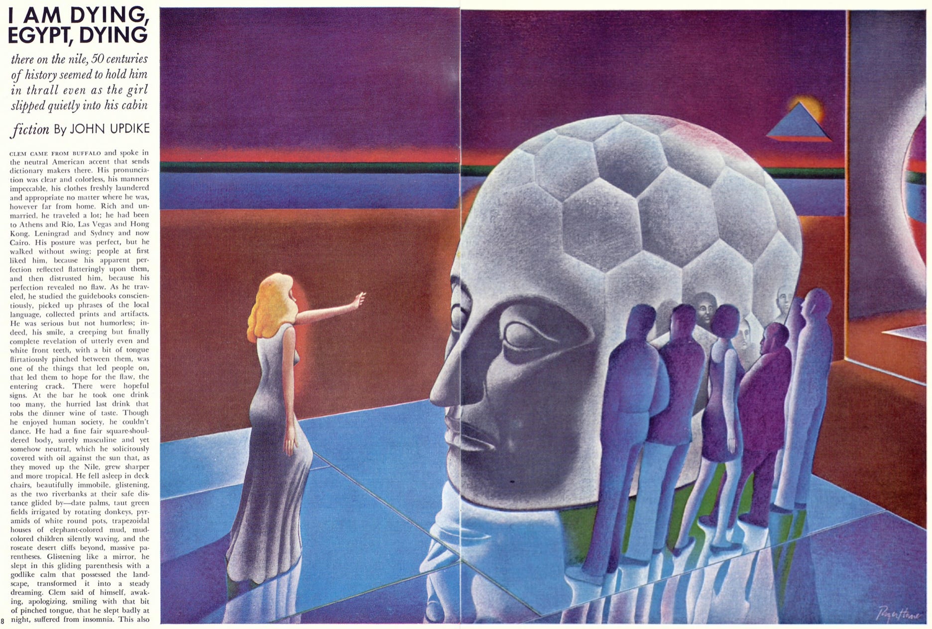 Let me spare you the trouble. The story art is better than the story itself. People smarter than me have called this a “bland character study.” It’s not Updike’s best work, and for a piece rejected by The New Yorker, it shows. Yoinks. Another story about a “regular dude” who’s come to Egypt to do … who fucking knows, criticize 30-year-old women and buy a kaftan so he can show it off later? The characters introduced throughout, try as they might, fail to bring about any development for this tepid tall glass of milk in human form. He can’t dance, he has no charisma, all he’s got is his height. Yet, he’s got two women pining after him—scarcity mentality at play!